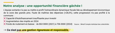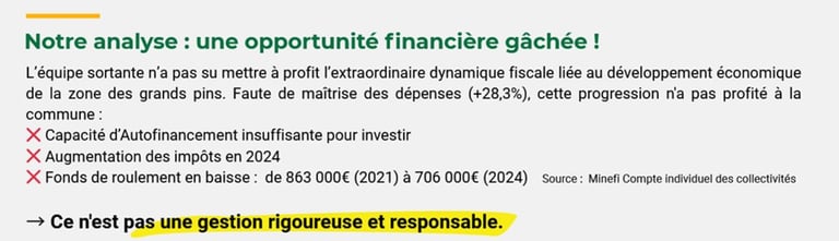 Comme évoqué dans notre analyse contradictoire du bilan de mandat de la liste sortante, la capacité d’autofinancement brute et la dette communale pèsent lourdement sur les comptes de la commune.