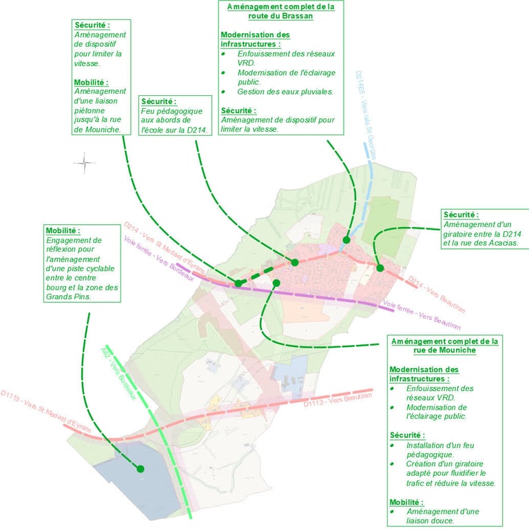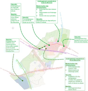 Ces aménagements intègreront des dispositifs de limitation de la vitesse, s’accompagnant de liaisons douces fonctionnelles (piétonnes, vélos) et sécurisées rattachées au cœur de notre village ainsi que d’aménagements paysagers confortant l’empreinte paysagère propre à notre commune assurant ainsi confort et agrément pour tous les usagers.